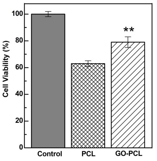 Plasma-induced covalent GO coating can affect the physicochemical properties of the PCL patch in terms of biodegradability and water uptake, as hydroxyl, carboxyl, and amine groups introduced at the material/medium interface improve the hydrophilicity of the patch surface. Water uptake is an important feature of biomaterials, which are designed to be somehow placed in the body (e.g., patches for regenerative applications and implants). This, because of a high water content, reduces interfacial tensions between the biomaterial and surrounding tissues, thus limiting inflammation [].