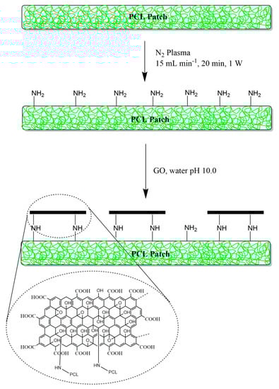 This patch is designed to be potentially employed as a scaffold for the protract treatment of injuries and burns so as to prevent inflammation and bacterial contamination, and provide suitable tissue regeneration in vivo. This was accomplished by tuning the electrospun PCL physicochemical surface features through low-vacuum nitrogen plasma activation and GO covalent functionalization (Scheme 1). In particular, PCL patches (6 µm fiber diameter, surface 2 × 21 cm2, ≈ 600 µm thickness) were employed as polymeric scaffold, as they are mechanically robust, biodegradable, and biocompatible. The surface functionalization involved two-step tandem reactions. In a first step, PCL patches were treated with low-vacuum nitrogen plasma, just enough to activate the microfiber surface with amine functions while still preserving the bulk microstructures. In fact, corrosion of the polymeric surface could occur, and this might affect the 3D macrostructure of the PCL scaffold. This approach has been successfully used for scaffold engineering to provide functionalization of the surface with primary amines, even if keeping bulk properties of the virgin polymeric material, and also to enhance cell adhesion properties of hydrophobic polymers [,,,]. Furthermore, primary amines also allow monolayer covalent deposition of GO through the reaction with epoxy groups intrinsically contained in GO sheets []. GO consists of single graphitic monolayer with randomly distributed aromatic regions (sp2 carbon atoms) and oxygenated aliphatic regions (sp3 carbon atoms) containing hydroxyl, epoxy, carbonyl, and carboxyl functional groups. Hence, GO was functionalized with aliphatic amines on the PCL surface under slightly basic conditions and without perturbing its main structure because of versatile chemistry of epoxy groups [,].