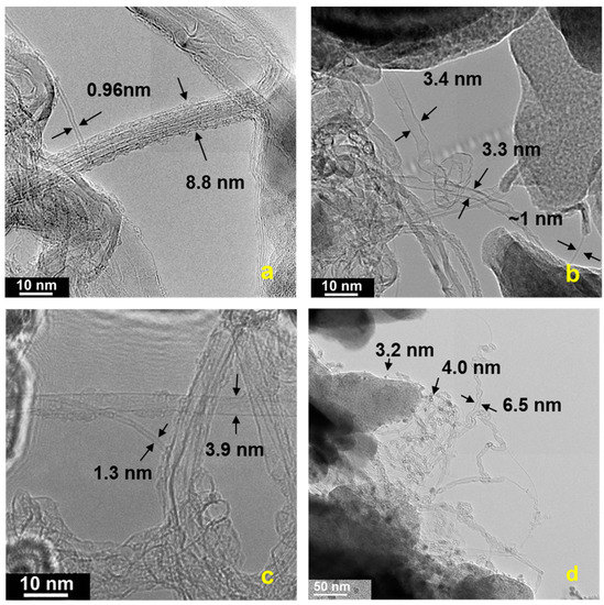 Since the CVD synthesis temperature did not exceed 760 °C across the board, and so there is no reason to expect contribution from graphite to the Raman spectra, which would otherwise be similar to spectra from SWCNTs with a semiconducting (zigzag) structure. However, radial breathing modes, which are unique to fullerenes and single/few-walled CNTs, are present. The 2D peak shape and shift with excitation wavelength are constant with 1–2 layer graphene; however, this would be also expected to exhibit a strong D band, which is only a minor peak in the spectra in Figure 3 [30,42,43].