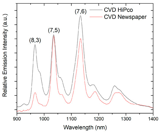 A comparison of the 660 nm excited fluorescence spectra from chemical vapor disposition (CVD) HiPco SWCNTs (black line) and CVD grown soot on “Voice of Asia” newsprint substrate (red line), depicting specific chiralities of semi-conducting SWCNTs present in both samples.
