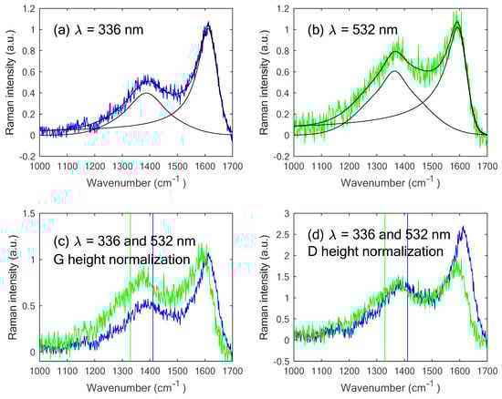 Raman spectra of the Barnett gas-shale obtained with an excitation wavelength of (a) 336 nm and (b) 532 nm. The fitting and its components (black lines) are also shown but the sub-bands are not represented for clarity. (c) and (d) show comparisons of both previous spectra (blue: 336 nm spectrum; green: 532 nm spectrum) while normalizing them using the G band intensity (c) and the D band intensity (d). The vertical lines represent the position of the D band for graphite for each excitation energy.