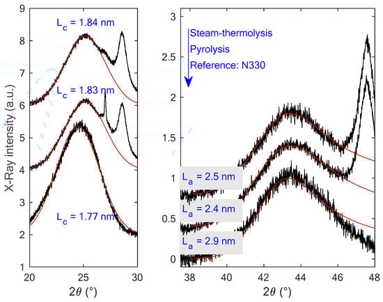 Judging from the XRD data, the carbon blacks are definitely not exactly the same before and after heat treatment. The other peaks in the diffractogramm are due to crystalline compounds incorporated as vulcanisation agents into the model tyre formulation. For the original N330 La ~2.9 nm while it is 2.4–2.5 nm for the recovered carbon blacks. The difference is significant. The most probable origin is the surface functionalisation of the crystallite by the elastomer functional groups while being decomposed. Lc can be seen to have increased after the post-treatments. This value takes into account the correction necessary for small crystallite size []. At a constant number of carbon atoms, Dopita et al. [] have shown that the shape of the crystallite does not play a role in the linewidth of 002. It is believed that this is due to the contribution of the carbonised remnants of the elastomer which were not fully eliminated by the treatments and ended by coating the carbon black nanoparticles, thereby adding atoms to the crystallite and so leading to an increase in Lc [].