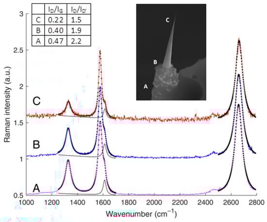 The associated Raman spectra obtained are also reported in Figure 8. The ID/IG ratio is the highest (0.47) on the microfiber part (A) in which the structural organization is less than in the cone [] and is the lowest (0.22) on the cone apex (C) where the graphenes are mostly perfect.