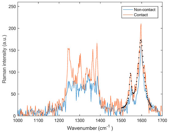 Tip-enhanced Raman scattering spectrum of a single-wall carbon nanotube with the silver tip in close vicinity to the surface. The fitting for the G− and G+ is indicated with dots.
