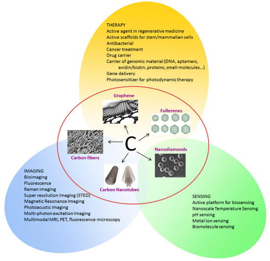 The interesting electrical, chemical, and mechanical properties of these objects, have led to a number of different types of applications. Concerning biology and biomedicine, the big potential of carbon nanomaterials is the possibility to tune the CNS dimensions, the capability to functionalize the surface, and the high chemical stability coupled to the optical and biomimetic properties. As an example, CNTs and fullerenes soon after their discovery have been studied for biosensing, drug delivery, and bioimaging [8,9]. Recently they experienced a revival for their application in the regenerative medicine [10], cancer therapy, and theranostic applications [11].