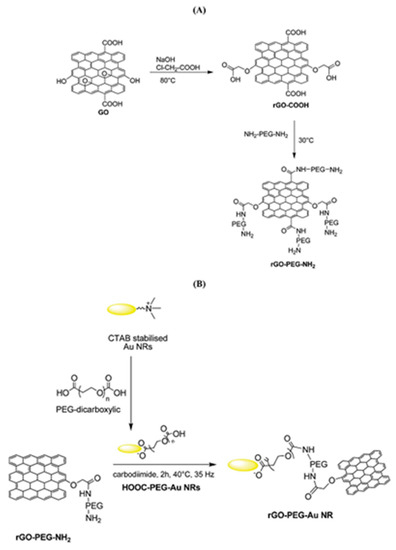 (A) Formation of PEG-modified reduced graphene oxide (rGO-PEG-NH2) and (B) rGO-PEG-Au NRs coated through the covalent linking of rGO-PEG-NH2. Reprinted with permission from [157].