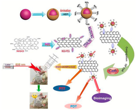 Utilizing upconversion nanocrystals is a promising method for NIR light-mediated bioimaging and photothermal and photodynamic therapy. Gulzar et al. [131,174] covalently functionalized nGO with core-shell structured unconversion nanoparticles in the steps as shown in Figure 7. Oleic acid stabilized NaGdF4: Yb3+, Er3+ was firstly synthesized followed by the formation of a NaGdF4: Nd3+, Yb3+ shell around it. The surface of the core-shell structure was then amino-modified via a phase transfer process using 2-aminoethl dihydrogen phosphate (AEP). GO was made using a modified Hummer’s method and PEGylated using the EDC intermediated synthesis method. Carbodiimide cross linking reaction between the amino group of amino-modified core-shell unconversion nanoparticles and the carboxyl group of NGO-PEG was employed for the covalent grafting of the unconversion core-shell structure. After loading with Ce6, cytotoxicity assays revealed decent biocompatibility and minor toxicity. This multifunctional cancer therapy platform has achieved superior therapeutic efficacy for in vitro and in vivo cancer therapy.