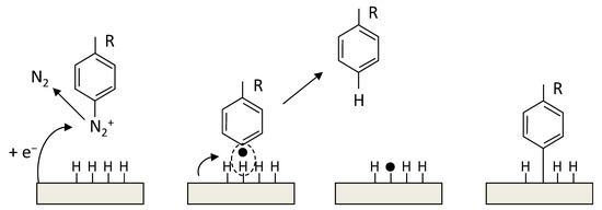 The radical functionalization of CNTs was reported with the use of perfluorinated alkyl iodides under UV light to generate radicals which functionalized SWCNTs. The products showed enhanced dispersion in CHCl3 [265]. In another study, photolysis of perfluoroazooctane was performed to modify the sidewall of SWCNTs based on radical reactions [266]. A simple approach to covalently functionalize CNTs is through diazonium salts (R-N2+X−). In the reaction, the reactive species are radicals, which forms through electron transfer between CNTs and the aryl diazonium salts. This reaction can proceed in organic or water media, or through electrochemical ways [267].