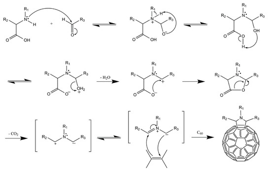 - Maggini, M.; Scorrano, G.; Prato, M. Addition of azomethine ylides to C60: Synthesis, characterization, and functionalization of fullerene pyrrolidines. J. Am. Chem. Soc. 1993, 115, 9798–9799. [Google Scholar] [CrossRef]