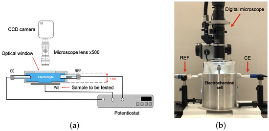 In situ observation using digital microscope KEYENCE VHX-5000 (Osaka, Japan) (equipped with long range zoom lens) was coupled to the conventional electrochemical set-up presented before. The set-up is schematically illustrated in Figure 1. The exposed sample area is scalable with a PTFE (Polytetrafluoroethylene also known as Teflon) adhesive mask to measure the electrochemical response of a very localized area.