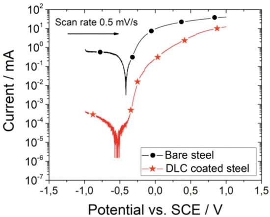 Polarization curves for a bare and coated with DLC (Diamond-like carbon) 100Cr6 steel plotted in a logarithm current scale.