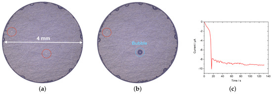 Two “macro” defects are clearly identified from initial in situ observations (red rings in Figure 7a). They measure approximately 30 to 50 μm. An open circuit potential (OCP) measurement is done and the value is stable at − 460 mV giving evidence of steel in contact with the solution. As it is difficult to observe any kind of other defect types than micro-uncoated areas, only these two are defined as clear corrosion pinholes candidates. When the −1.2 V potential is applied, a current is detected and reach a steady state of − 9 μA (Figure 7c). Above one of the defects, a gas bubble starts to form and grows, it remains stuck to the surface probably due to surface tension forces. Surprisingly, the other one has no visible bubble, but this doesn’t mean that no reaction occurs for this defect.
