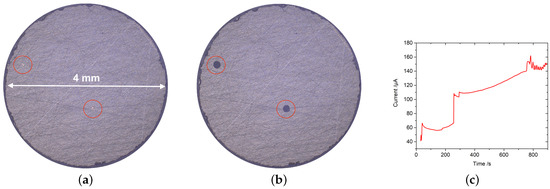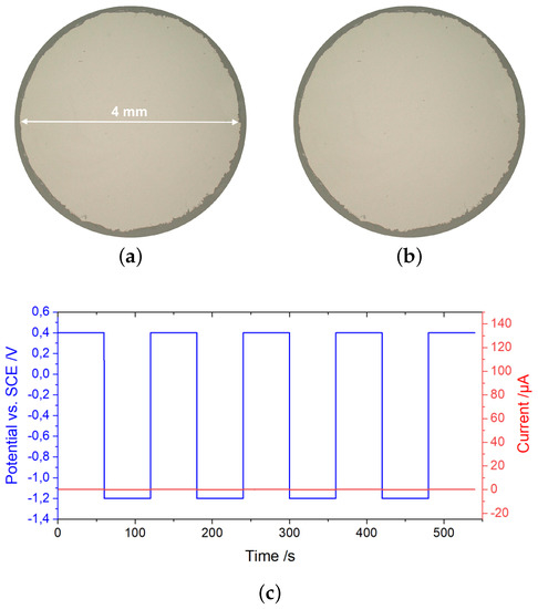 A first experiment using this electrochemical activation combined with digital microscope observations, a 4 mm diameter disk surface of a mirror-like polished steel B (90MnCrV8) coated with the DLC coating is tested (Figure 12). This surface appears to be free of uncoated areas or any visible coating defects. The use of a mirror-like polished specimen helps to easily detect intrinsic features of the coating. During the test, when the square wave polarization is applied, no current was recorded, and the current plot remains flat at 0 μA (Figure 12c). The observation of the exposed surface along the polarization confirms that no feature is visible to suggest corrosion attacks or anything else. This validates that a-C:H is chemically inert with good insulating properties. Thus, as soon as the steel specimen is fully covered by DLC coating and free of defects from deposition stage, the sensitive steel substrate is completely protected against corrosion.