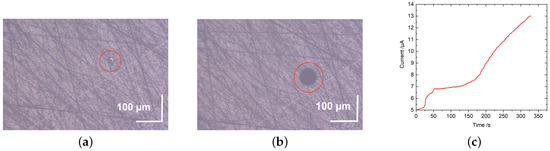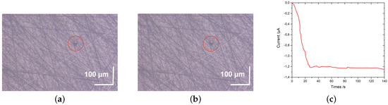 In situ observations (a) initial image (t = 0 s) and (b) final image (t = 130 s) and (c) curve of a coated surface under −1.2 V static polarization.