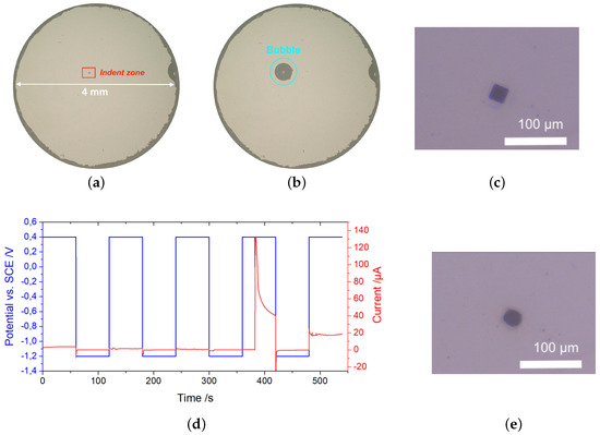 In situ observations (a,c) initial images (t = 0 s), (b) intermediary image (t = 450 s) and (e) final image (t = 540 s) and (c) curve of the same coated surface (as Figure 12) with one artificial defect (done by using a Vickers indenter tip) under square wave polarization.
