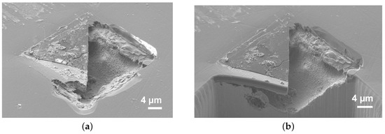 In addition, finally, on a third sample, an uncoated area found via an SEM observation was isolated. Figure 15a presents an SEM image of this defect untouched before any electrochemical activation. It measures around 10 μm. Then, this defect is submitted to the electrochemical activation and then re-observed in a cross section using SEM-FIB. The surface tested was still a 4 mm disk. The electrochemical stimulation was stopped after two active anodic steps in order to limit damage to the defects and preserve its initial shape.