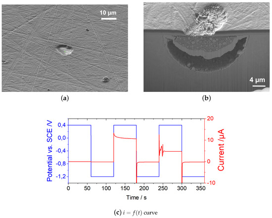 Contrary to the previous experiment (Figure 12c), a current is now recorded. At the beginning, it is not significant in the three first anodic steps, but, in the fourth, it drastically increases to reach at step end a value of 40 μA. In the fifth step, the anodic has a steady state value of 20 μA. The cathodic currents remain quite low at 0.4 μA compared to anodic ones. A bubble has been observed in the cathodic step at t = 450 s. The geometry of the squared artificial defect has also changed to become slightly rounded. The test is no longer continued after 540 s to perform a fine observation of the surface. The specimen zone, where the indentation artificial defect is located, is studied in the SEM-FIB device (Figure 14a). Half of the mark made by the Vickers tip is still visible on the left side of the SEM surface image. The other side has been totally removed, probably by the combined alternative effect of bubbling and steel dissolution.