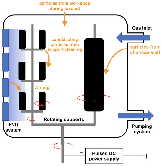 Diagram of an industrial PVD(Physical Vapor Deposition)/PACVD (Plasma Assisted Chemical Vapor Deposition) reactor with typical sources of defects.