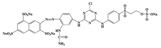 The dye chosen for the adsorption studies was Remazol Yellow 3RS 133% (Dystar, Singapore), CAS number: 140876-15-9. This is an anionic sulfonated azo dye and its molecular structure is presented in Figure 1. Stock solutions containing 200 mg/dm3 of RY were prepared everyday using deionized water and posteriorly diluted to obtain different working concentrations. Batch adsorption experiments were performed in 10 mL vials, at 25 ± 1 °C, under constant agitation (1000 rpm) and dark environment. To investigate the effects of pH (2–6) and adsorbent dosage (1–4 g/dm3), an initial concentration of 20 mg/dm3 of RY and a contact time of 150 min were used. The study on the effect of contact time (kinetic study) was performed up to 360 min, at the natural pH of RY solution (6.0), an initial concentration of 100 mg/dm3, and an adsorbent dosage of 4 g/dm3. The influence of different initial concentrations (equilibrium studies) was performed at an adsorbent dosage of 4 g/dm3, contact time of 150 min, and an initial dye concentration in the interval of 20–200 mg/dm3.