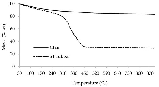 Thermogravimetric curves are presented in Figure 2 for both ST rubber and char. A mass loss of 70% of ST rubber occurred up to around 440 °C from which the thermal degradation stabilized, remaining around 30% of carbonaceous residue. The char still lost around 18% (a fraction of this loss is related to water release) of its mass up to 900 °C, indicating the presence of some unconverted carbon [28,29].