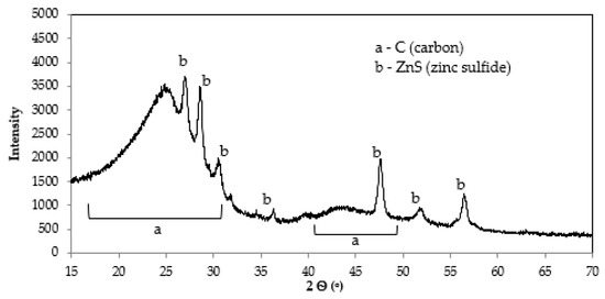 The XRPD analysis allowed identifying the main crystalline mineral phases in char composition. The XRD pattern (Figure 3) is typical of ST-derived chars, as the peaks observed were mainly attributed to zinc sulfide (ZnS) [25,31,32]. The ZnO used as accelerator in rubber vulcanization suffers sulfidation with the hydrogen sulfide (H2S) generated during ST rubber pyrolysis [33,34].