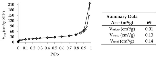 The char presented an isotherm of type II according to the IUPAC classification [36], which is typical of non-porous or macroporous materials, representing unrestricted monolayer–multilayer adsorption. However, the presence of the hysteresis loop indicates some mesoporosity [37]. This hysteresis loops is of Type H3, usually given by non-rigid aggregates of plate-like particles, but also for the case in which the pore network consists of macropores not completely filled up with pore condensate [36]. The char presented an apparent surface area (ABET) of 69 m2/g and total pore volume (Vtotal) of 0.14 cm3/g, most of which corresponded to mesopores. This isotherm profile is typical of tire-derived chars, being largely determined by the carbon black from the original tire material that remains in the chars after pyrolysis [27,32,35].