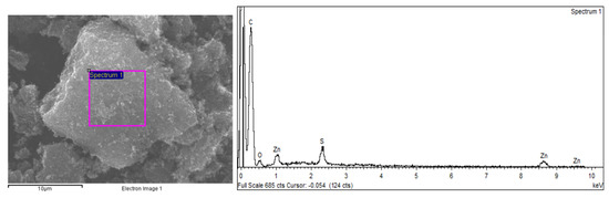 The SEM image of the char particles (Figure 5) shows a rough surface with nanosized mineral clusters. This rough and heterogeneous morphology at the char surface has already been observed in tire-derived char particles [25,32,35]. The EDS spectra indicated that the char particles were carbonaceous in nature and the agglomerated mineral clusters were composed mainly of ZnS which is in accordance with the XRPD analysis.