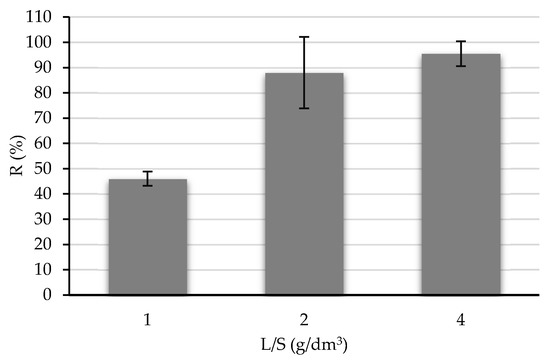 The study on adsorbent dosage (Figure 6) indicated that a S/L ratio of 4 g/dm3 gave the highest average removal percentages of RY (almost 100%). This was expected, as the higher the mass of adsorbent used, the higher the removal of RY because more adsorption sites are available. However, the difference between the adsorbent dosages of 2 and 4 g/dm3 was small. High adsorbent dosages of chars usually do not provide benefits on the adsorption process, since it is observed as an agglomeration effect of the char particles, reducing the surface area available for adsorption [39,40].