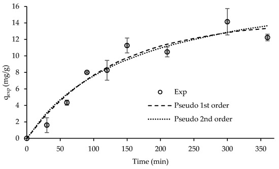 The kinetic data were modelled through pseudo-first and pseudo-second order kinetic models (Equations (3) and (4), respectively) to describe adsorption data obtained under non-equilibrium conditions [18,19,20]. These kinetic models assume that the process is controlled by the irreversible adsorption reaction at the liquid/solid interface in the adsorbent, neglecting the effects of film and pore diffusion; the uptake rate is first or second order with respect to the available surface coverage.