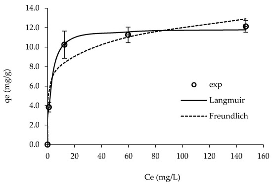 Experimental data and fits of the Langmuir and Freundlich models for the adsorption of RY on ST-derived char. Conditions: contact time = 150 min; solution pH = 6.0 (natural); char dosage = 4 g/dm3. Exp—experimental data. Error bars of duplicates are shown.