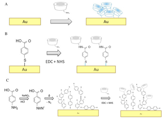 Scheme about surface modification methods: (A) Direct adsorption of amino-β-CD onto gold surfaces; (B) covalent attachment by amide bond formation with carboxylic groups of a self assembled monolayer by 4-mercapto-benzoic acid. EDC is for N-(3-dimethylaminopropyl)-N0-ethylcarbodimide and NHS is for N-hydroxysulfosuccinimide; C) covalent bond between amine and carboxyl groups of the electrografted diazonium salt from 4-amino benzoic acid. Reproduced from [26], with permission from Elsevier, 2016.