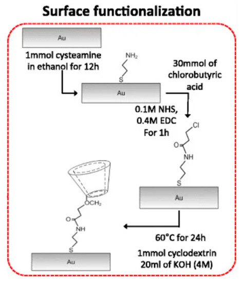 The functionalization of CDs with long alkyl thiothers as spacers allows obtaining self-assembled structures with improved surface coverage and order [30]. However, the incorporation of alkyl chains decreases the conductivity of the organic molecules that hampers their use in applications based on electron transfer processes [31]. Therefore, alternatives to immobilize CDs with a proper orientation on gold electrodes without the synthesis of thiol-modified cyclodextrins is also proposed by bottom up techniques. These techniques typically consist on chemical modifications of gold surfaces in order to then subsequently bind CDs on top.