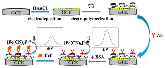 Illustration about the fabrication procedure of electrochemical prion immunosensors. Glassy Carbon Electrode (GCE), Bovine Serum Albumin (BSA), prion antibody (PrP), antibody (Ab). Reproduced from [34], with permission from Elsevier, 2014.