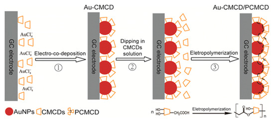 Scheme of the fabrication of gold-carboxylmethyl-cyclodextrins (Au-CMCD) electrode and gold-carboxylmethyl-cyclodextrin/cyclodextrin-polymer (Au-CMCD/PCMCD) electrode. Reproduced from [36], with permission from Springer, 2016.