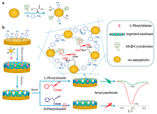Metal-organic framework (MOF) material with regular and orderly structure has attracted extensive attention for preparing sensors [38,39] as well. More recently, Wu et al. [40] developed a sensor with specific recognition cavities in imprinted microporous-metal-organic-framework (MI-MOF) membrane. Golden nanoparticles (GNPs) have been functionalized by SH-β-CDs and L-cysteine (L-Cys) and then electrodeposited onto electrode together with L-phenylalanine (L-Phe). Afterward, L-Phe has been removed from the CDs cavities by washing in methanol and acetic acid. Finally, cyclic voltammetry and differential pulse voltammetry measurements with different L-Phe target concentrations have demonstrated good selectivity respect to typical interfering molecules of the D-Phenylalanine (D-Phe; Scheme 6).