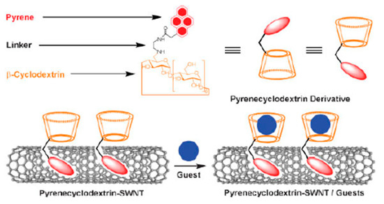 Schematic drawing of pyrenecyclodextrin-decorated single-walled carbon nanotube (SWCNT) hybrids and their interaction with target molecules. Reproduced from [64], with permission from John Wiley and Sons, 2008.