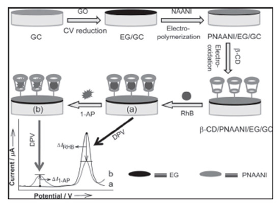 Assay protocol of dual-signaling electrochemical sensor based on the competitive host-guest interaction between β-CD and rhodamine B (RhB) (reporting probe)/1-aminopyrene (1-AP) (target). GC is for Glass Carbon (electrode), GO is for Graphene Oxide, CV is for Cyclic Voltammetry, EG/GC is for Graphene/Carbon (electrode), NAANI is for N-acetylaniline, DPV is for Double Pulse Voltammetry. Reproduced from [71], with permission from John Wiley and Sons, 2013.