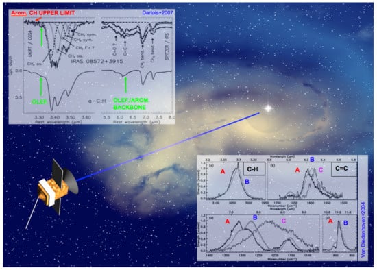 - Dartois, E.; Geballe, T.R.; Pino, T.; Cao, A.-T.; Jones, A.; Deboffle, D.; Guerrini, V.; Bréchignac, P.; D’Hendecourt, L. IRAS 08572+3915: Constraining the aromatic versus aliphatic content of interstellar HACs. Astron. Astrophys. 2007, 463, 635–640. [Google Scholar] [CrossRef][Green Version]