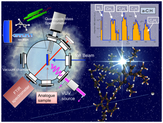 Typical scheme of experiments aiming at following the evolution of a dust analogue subjected to either ion irradiation simulating cosmic rays [126] or energetic VUV photons [127] from the interstellar radiation field. An interstellar analogue is placed at the center of the chamber, maintained at interstellar low temperatures and the evolution and products of the photolysis and or radiolysis are monitored both in the solid phase and the gas phase. Insert QMS spectrum from Dartois et al., A&A. 599, A130, p6, 2017, reproduced with permission © ESO.