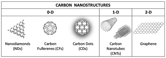 Due to its ability to assume different hybridization states, including sp2 and sp3 hybridization, carbon can form different allotropes (e.g., graphite, diamond, and fullerene-like structures) which exhibit peculiar chemical and physical characteristics derived from their specific structure. A range of carbon nanostructures (CNs) have recently raised the interest of material scientists due to the extraordinary characteristics related to their nanoscale size. Among carbon nanostructures, we can count 0-D systems such as nanodiamonds (NDs), fullerenes (CFs) and carbon dots (CDs), 1-D carbon nanotubes (CNTs) and nanofibers, as well as 2-D graphene-based nanostructures (GBNs) (Figure 1). Due to their outstanding physical, chemical, mechanical, thermal, electrical and optical properties [1], CNs are extremely attractive for a wide range of applications in electronics, optoelectronics, sensing, mechanics, construction, automotive, and aerospace fields [2,3,4,5].