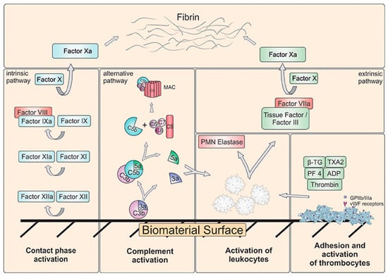 Schematic representation of the main biological processes that can occur at the blood-biomaterial surface. Reproduced with permission from [54].