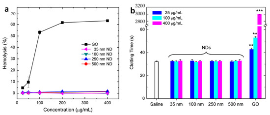 (a) Hemolysis percentages measured by exposition of RBCs to ND (35, 100, 250, and 500 nm in diameter) and graphene oxide (GO) samples at the concentration range of 25–400 μg/mL. Reproduced with permission from [83]. (b) Activated partial thromboplastin time (aPTT) assays of GOs and oxidized NDs of different size using human serum. ** p < 0.01 and *** p < 0.001 Reproduced with permission from [83]. NDs showed significantly lower hemolysis respect to GO and values comparable to saline negative control for the aPTT.