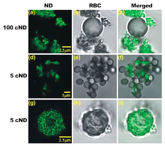 Nanodiamond interaction with human RBCs. Fluorescence (a,d,g), bright field (b,e,h) and merged optical microscopy images (c,f,i) of 100 nm (a–c) and 5 nm (d–i) nanodiamond particles. The images show larger NDs (100 nm) attaching to the cell membrane and smaller NDs (5 nm) penetrating inside the erythrocytes. Reproduced with permission from [86].