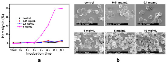 (a) Hemolysis ratio of RBCs induced by fluorescent carbon dots with different concentrations. (b) SEM images showing the morphology and aggregation of RBCs incubated with the fluorescent carbon dots at different concentrations. Reprinted with permission from [116]. Copyright 2015 American Chemical Society.