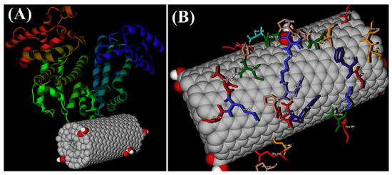 Predicted binding model of BSA molecule on COOH-MWCNTs. (A) Lowest docking energy conformation; (B) amino acid residues involved in binding interactions. According to the model, 29 amino acid residues of domain II of BSA took part in the binding interactions of BSA with COOH-MWCNTs. The presence of hydrophobic (Ala, Leu, Pro, Phe, and Val) and aromatic (Tyr and Phe) residues suggested that the binding forces between BSA and COOH-MWCNTs include hydrophobic and π-π stacking interactions. Reprinted from [135], with permission from Elsevier.
