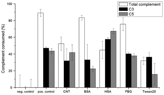 Although it is difficult to draw general conclusions, CNTs have often been found to interfere with proteins inducing conformational changes. Modification of the secondary and tertiary structure was registered for albumin [134,135,136,137,139] hemoglobin, myoglobin [149], and other proteins [131,150]. The extent of this effect is a critical parameter to be investigated, since conformational alterations could lead to severe modification of protein functionality or affect the subsequent interactions of the CNT-protein system with cells, platelets, and other biological components, finally determining the fate of the nanotubes in the biological system [129]. The adsorption of complement components to carbon nanosurfaces and modification of their structural configuration may lead to the activation of the complement system and consequently induce inflammation, granuloma formation, or other side effects, such as acute allergic-like reactions and anaphylaxis [151,152]. Investigating the consumption of the complement system from human serum by single- and double-walled CNTs, Salvador-Morales et al. showed that all the types of CNTs tested activated the complement system in a dose-dependent manner via both classical and alternative pathways, with dominance of the classical pathway related to C1q binding in the case of SWCNTs [145]. Conversely, direct binding of C1q and C1s-C1r-C1r-C1s catalytic subunit was detected by TEM imaging on MWCNTs but not on SWCNTs [153]. C1q and C1s-C1r-C1r-C1s were tidily distributed on the side walls of MWCNTs, but no evidence of activation of the C1q complex was found. In a recent quantitative analysis, the complement components C1, C4a and C4b have been identified in the protein corona of COOH- and N-functionalized MWCNTs, confirming the potential of MWCNTs to activate the complement system via the classical and alternative pathways and suggesting a possible role of CNTs as initiators of local inflammatory reaction via the C4a component [141]. Moreover, the consumption of C3 and C5 (which is a marker of MAC-Membrane Attack Complex formation) was registered following incubation of both pristine and derivatized CNTs in human serum (Figure 8) [154]. As the products of complement activation (i.e., C3b, C4b, iC3b, C3d, etc.) may act as adjuvants in the immune response to foreign materials and trigger phagocytosis and effector cytokine response, the potential of CNTs to activate the complement system is a cause of concern for possible adverse responses, like inflammation and granuloma formation [155]. Attempts to modify CNT surface by pre-absorption of proteins (e.g., HSA) or immobilization of molecules (e.g., PEG) have shown potential reduction but not complete exclusion of complement system activation [151,156,157].