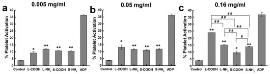 Platelet activation induced by four different types of functionalized CNTs, including long (L) and short (S) MWCNTs at different concentrations: 0.005 mg/ml (a), 0.05 mg/ml (b) and 0.16 mg/ml (c). Dose-dependent platelet activation was observed. At the highest concentration (c), long L-COOH and L-NH2 induced higher level of platelet activation than S-COOH and S-NH2, respectively. *: significant difference from the negative control (* p < 0.05, ** p < 0.01); #: significant difference between the indicated MWCNTs (# p < 0.05, ## p < 0.01). Reprinted with permission from [166].