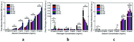 Absorbance of free plasma proteins (albumin (a), fibrinogen (b), and globulin (c)) following incubation with GO nanosheets with different lateral sizes. The * on double horizontal bars denotes statistically significant differences among all samples for p < 0.05. The ** on single horizontal bars indicate statistically significant differences for two specific samples being compared for p < 0.1 and 0.05, respectively, while n.s denotes statistically not significant. The absorption of the different protein species depends on the size and concentration of GO. Adapted with permission from [62]—Published by The Royal Society of Chemistry.