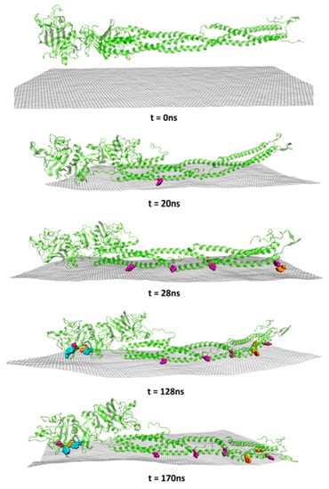 Simulated molecular adsorption dynamics of bovine Fng onto graphene surfaces. After initial contact, Fng molecules rearrange on the graphene surface due to hydrophobic interactions. The aromatics rings of protein amino acid residues Tyr (purple), Phe (orange), and Trp (blue) align with the graphene surface facilitating π-π stacking interactions. Reproduced with permission from [200]. Copyright 2015 American Chemical Society.