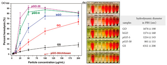 (a) Percent hemolysis of RBCs incubated with different concentrations of graphite oxide colloidal suspension obtained from Hummers’ method (GO) and smaller graphene oxide obtained with sonication or hydrothermal processing (bGO, pGO-5, pGO-30, and GS). (b) Photographs of RBCs after exposure to the different GO samples, with red hemoglobin in the supernatant indicating the presence of RBCs with membrane damage. The hemolysis rate was dose- and size-dependent. Adapted with permission from [213]. Copyright 2011 American Chemical Society.